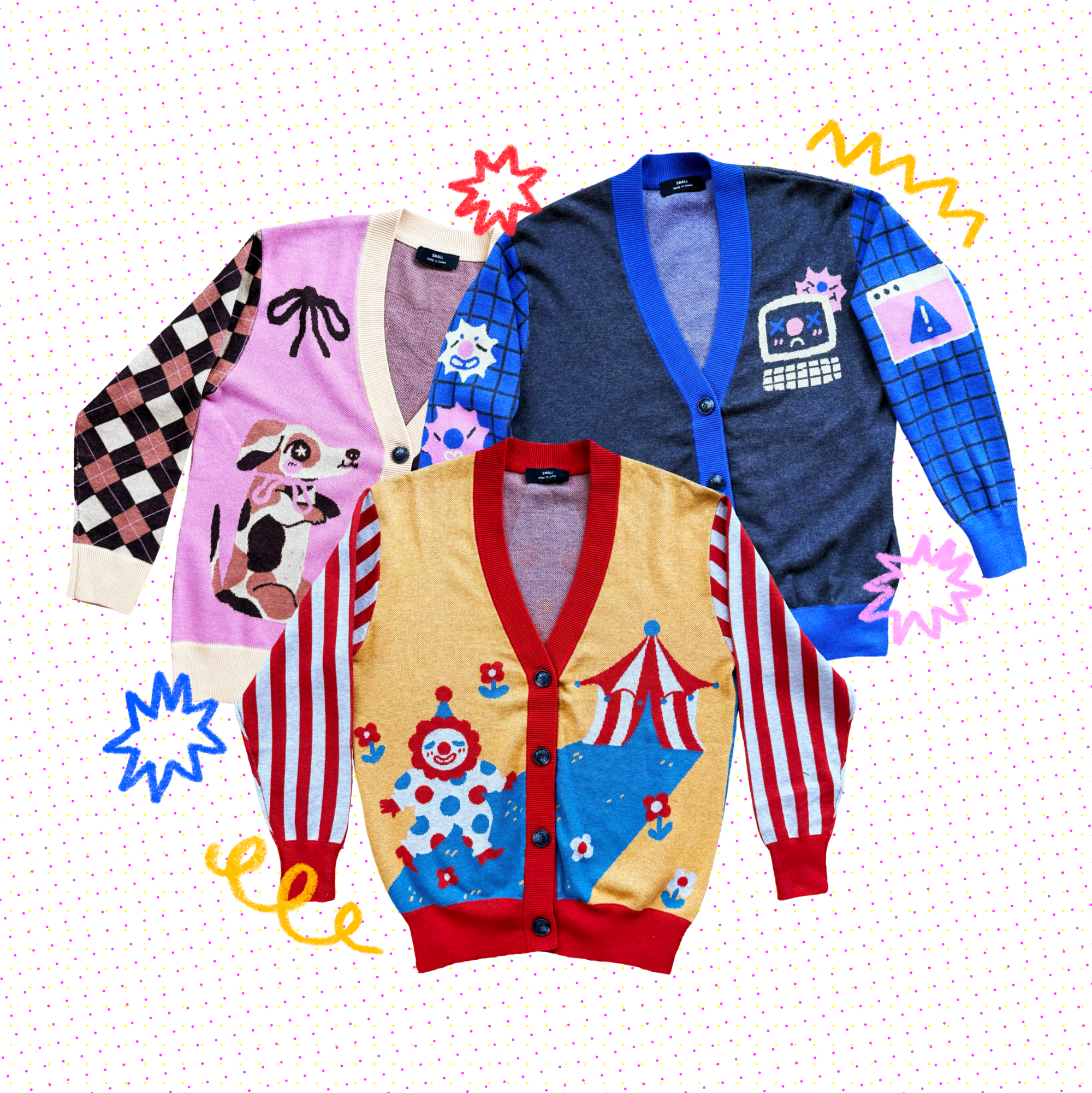 My first ever cardigan designs!🥹 Three very different designs featuring a bunch of silly friends💖